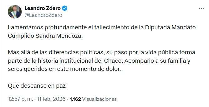 El gobernador del Chaco, Leandro Zdero, se pronunció este miércoles tras conocerse el fallecimiento de la ex legisladora nacional Sandra Mendoza. A través de su cuenta oficial en la red social X (anteriormente Twitter), el mandatario provincial envió un mensaje de respeto y acompañamiento a los allegados de la dirigente peronista.