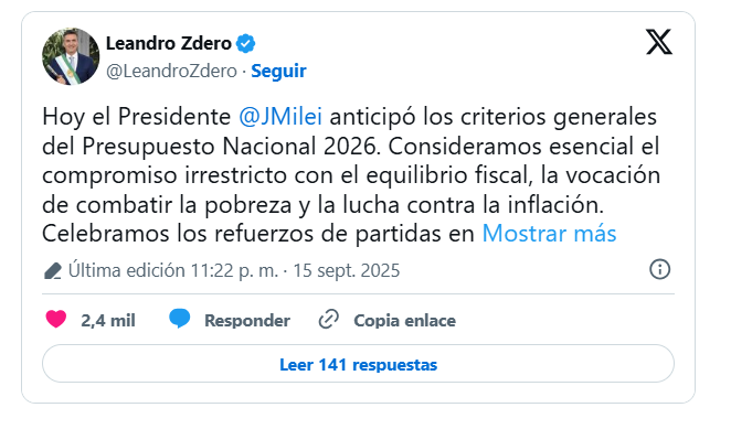 El gobernador del Chaco, Leandro Zdero, se manifestó en X tras el discurso del presidente Javier Milei en la presentación del Presupuesto 2026, este lunes por la noche. “Consideramos esencial el compromiso irrestricto con el equilibrio fiscal, la vocación de combatir la pobreza y la lucha contra la inflación” remarcó.