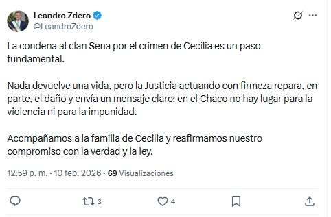Minutos después de que se diera a conocer la sentencia condenatoria contra los integrantes del denominado «Clan Sena» por el crimen de Cecilia Strzyzowski, el gobernador de Chaco, Leandro Zdero, utilizó sus canales oficiales para sentar la postura del Ejecutivo provincial ante un fallo histórico que mantuvo en vilo al país.